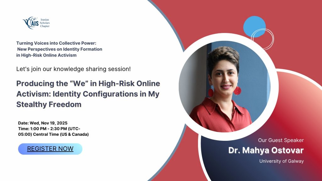 Join us for a knowledge-sharing session hosted by the AIS Iranian Scholars Chapter. We are honored to host Dr. Mahya Ostovar (University of Galway) for her presentation: “Producing the ‘We’ in High-Risk Online Activism: Identity Configurations in My Stealthy Freedom.”